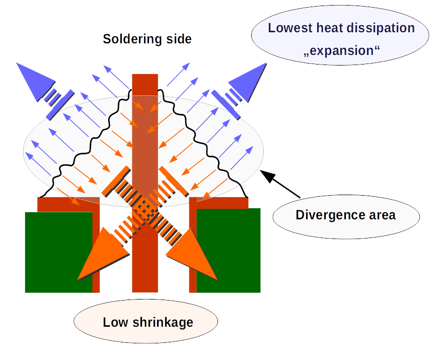 If the heat dissipation does not take place, the solder is in a state of thermal limbo. The persistence of the solder in the direction of the lowest heat dissipation ("expansion") opposes the shrinkage forces which are too low but still effective.