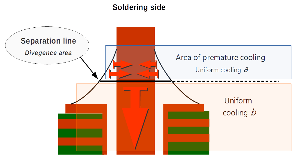 If the heat dissipation does not take place, the solder is in a state of thermal limbo. The persistence of the solder in the direction of the lowest heat dissipation ("expansion") opposes the shrinkage forces which are too low but still effective.