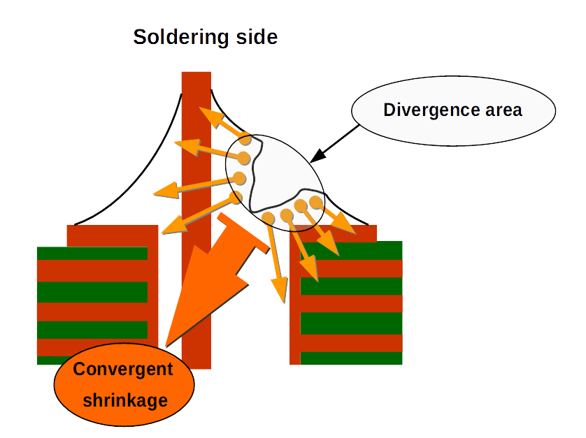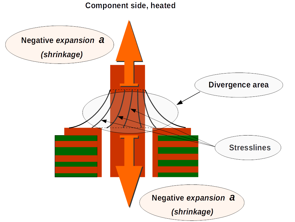 If the heat dissipation does not take place, the solder is in a state of thermal limbo. The persistence of the solder in the direction of the lowest heat dissipation ("expansion") opposes the shrinkage forces which are too low but still effective.